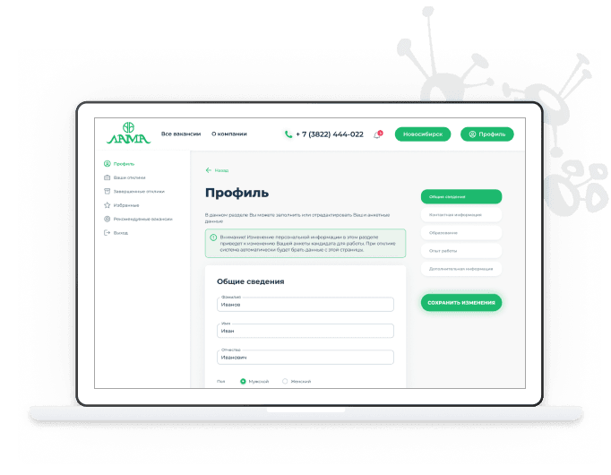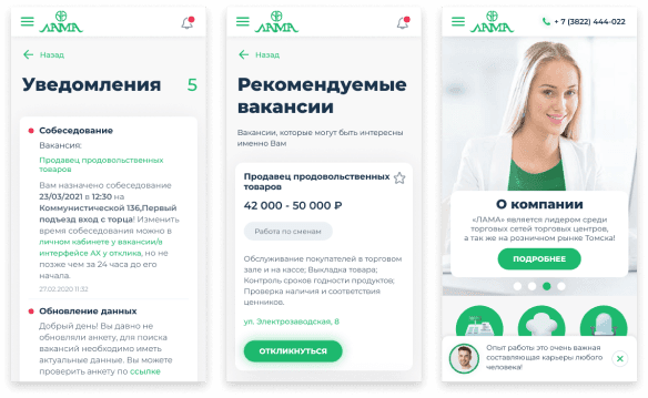 В личном кабинете кандидат может управлять своими вакансиями: совершать отклики на интересующие, просматривать избранные вакансии, отслеживать обратную связь от компании, записаться на соборование к руководителю и т.д Все страницы адаптируются под разрешение устройства пользователя.