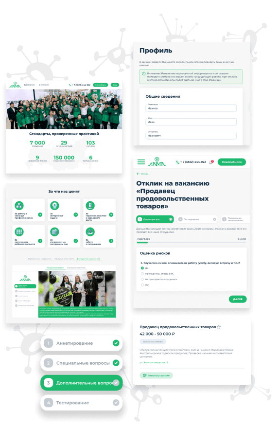 Процесс трудоустройства представляет собой несколько этапов. Количество этапов зависит от вакансии. На каждом этапе кандидату может быть предложено задание, предусмотренное для данной специальности. Вакансии (психологическое тестирование, профессиональные тесты). HR специалист отслеживает «движение» кандидата по заложенным в алгоритм этапам отбора.