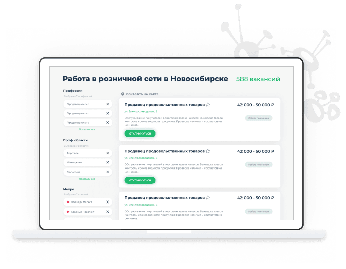 Все вакансии поступают на платформу из внутренней ERP системы. Для удобства пользователей сделано разделение по городам, категориям. В рамках каждой категории пользователь может фильтровать по профессии, профессиональной области, метро/району, графику работы и форме занятости. При детальном просмотре вакансии можно ознакомиться с требованиями, условиями труда и адресом на интерактивной карте.
