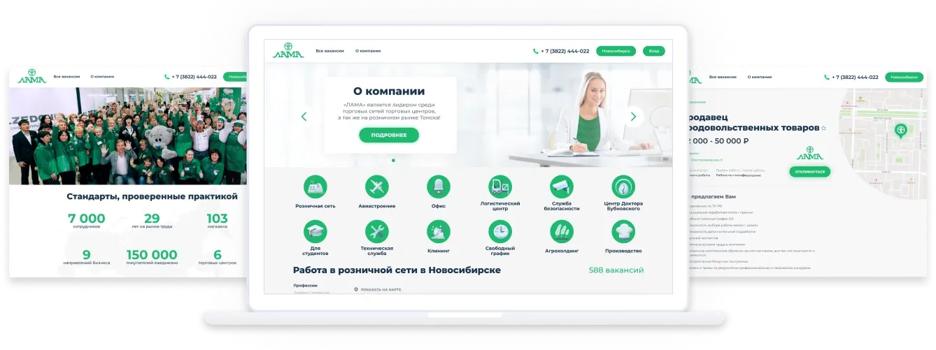 Информационная страница с ключевой информацией для кандидата. Включает в себя схему экосистемы компании, бонусы для работников, отчеты о внутренних мероприятий для сотрудников, отзывы о работе в компании, новости и карьерные возможности.