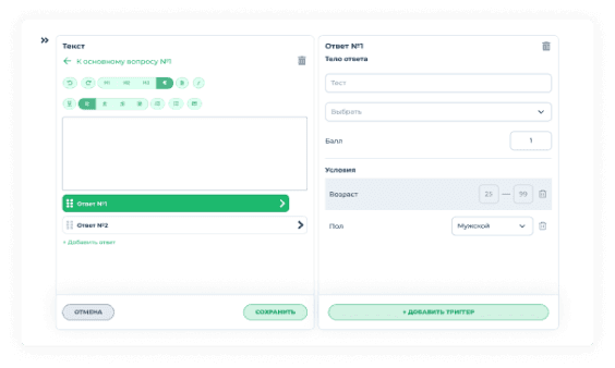 Количество набираемых баллов и критерий, к которому добавляются баллы, указывается для каждого добавленного варианта ответа индивидуально. В качестве дополнительного условия начисления баллов может выступать информация из анкеты кандидата: Пол, Возраст, Наличие детей, Семейное положение.