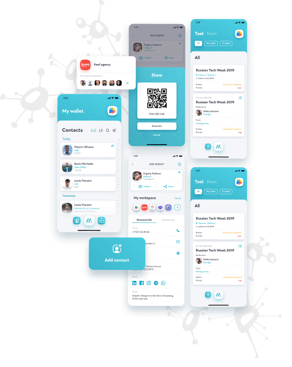 Сервис, позволяющий малому и среднему бизнесу выстроить работу по работе с контактами в цифровой среде. Сделать переход от бумажных визиток к CRM максимально простым и удобным. Проект имеет мобильные приложения и веб личный кабинет для сотрудников. Личный кабинет позволяет добавлять и просматривать контакты, проводить анкетирования, выполнять задания и др. В общем - здорово!
