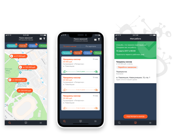 В мобильном приложении реализована возможность объединять вакансии в кластеры для удобного отображения, а также сортировать их по удаленности от места жительства.