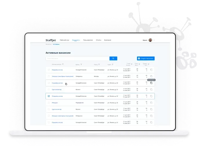Кабинет оператора компании Staffjet или рекрутера бизнеса, который заказал подбор. Через него можно разместить заявку, мониторить и управлять процессом отбора, просматривать карточки кандидатов и тд.
