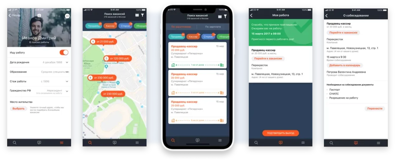Разработанное мобильное приложение направлено на кандидатов. В нем они могут подобрать себе вакансию из перечня размещенных в системе, посмотреть какие вакансии максимально близки к их дому (это очень важно, когда речь идет про данную категорию кандидатов), записаться на собеседование и отслеживать статус по себе.