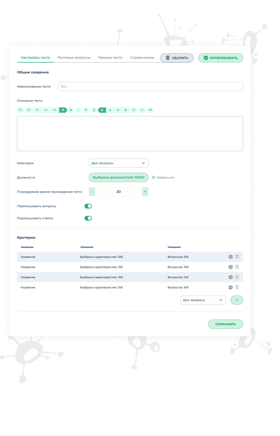 HR специалист может как воссоздать в системе существующий тест так и сформировать абсолютной новый