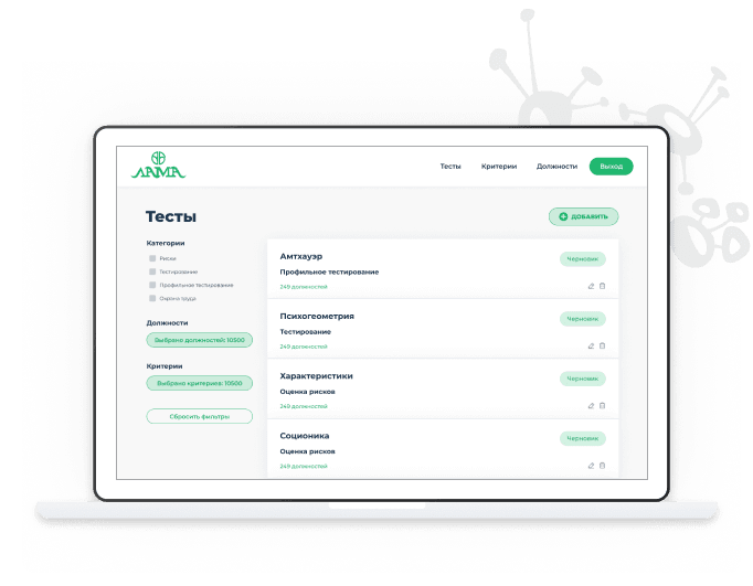 Система может содержать неограниченное количество тестов созданных HR специалистом или разработчиком по техническому заданию. Каждый тест имеет текстовое описание и отображается только для определенных вакансий.