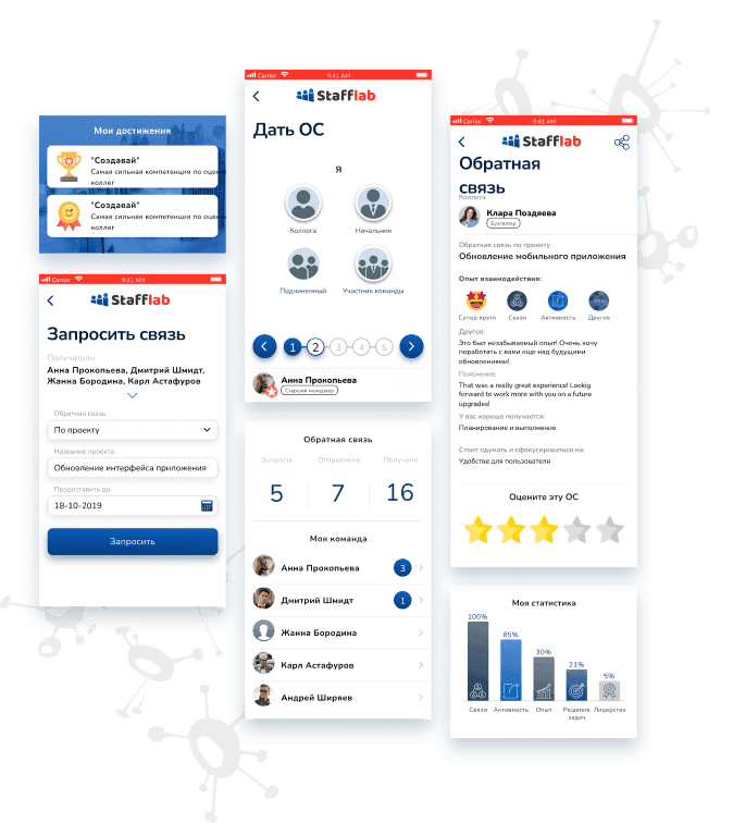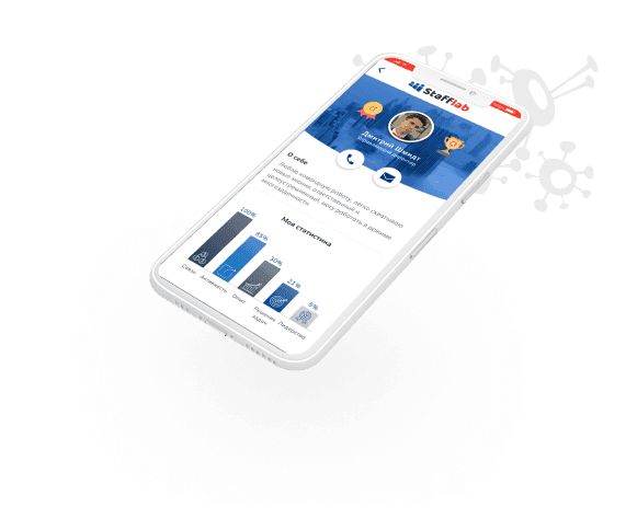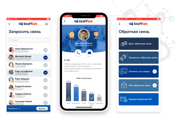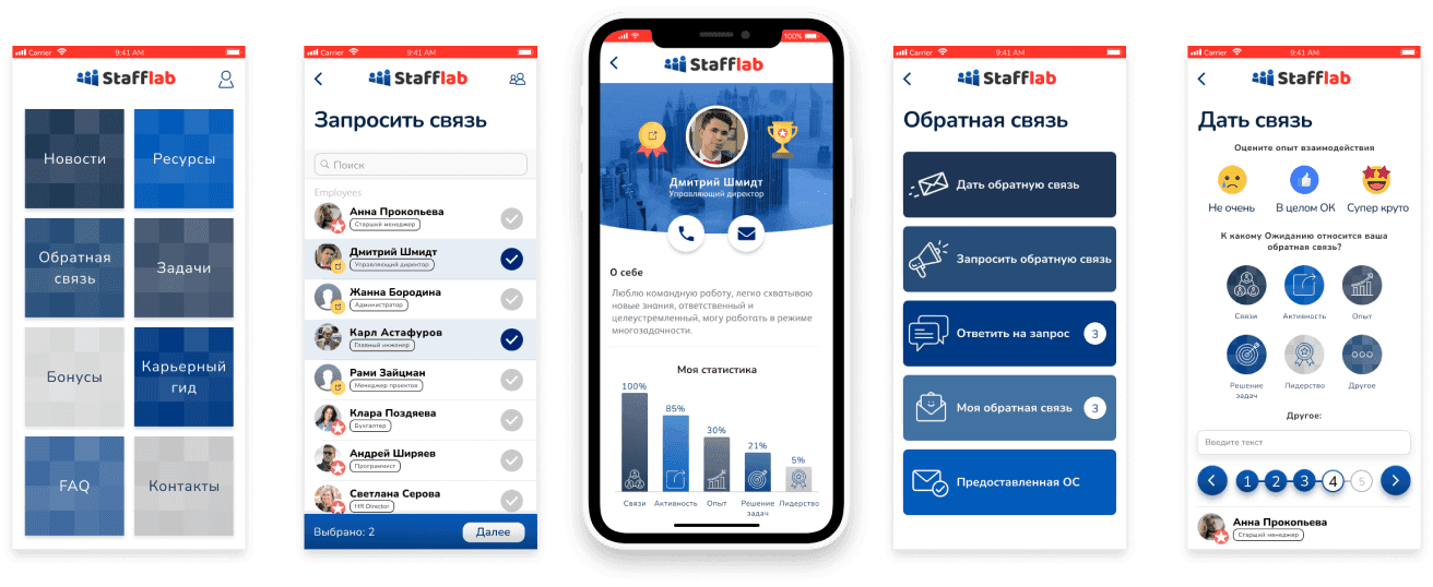 Мобильное приложение сотрудника имеет наибольшее количество разнообразного функционала, просмотр важной справочной информации компании, в том числе с динамичной орг. структурой, трекер задач и достижений, возможность поделиться обратной связью, корпоративные игры и др.